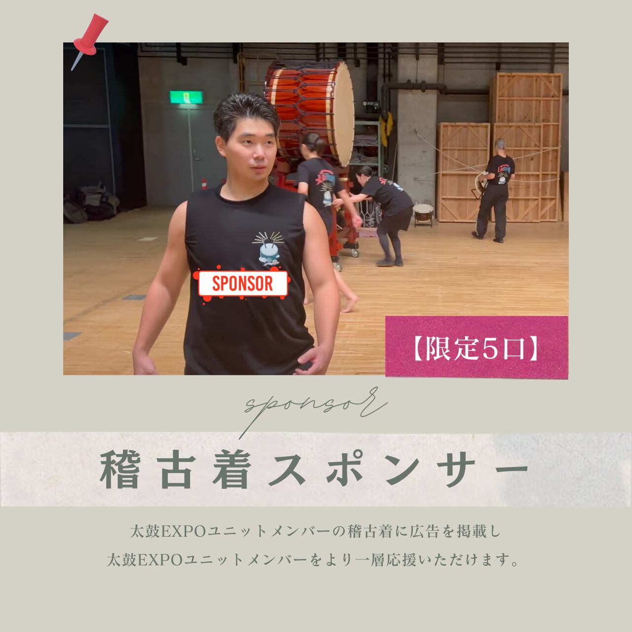 太鼓EXPOユニットメンバーの稽古着に広告を掲載し、ユニットメンバーをより一層応援いただけます。(対象期間:申込完了日〜公演終了後の2025年シリーズまで)